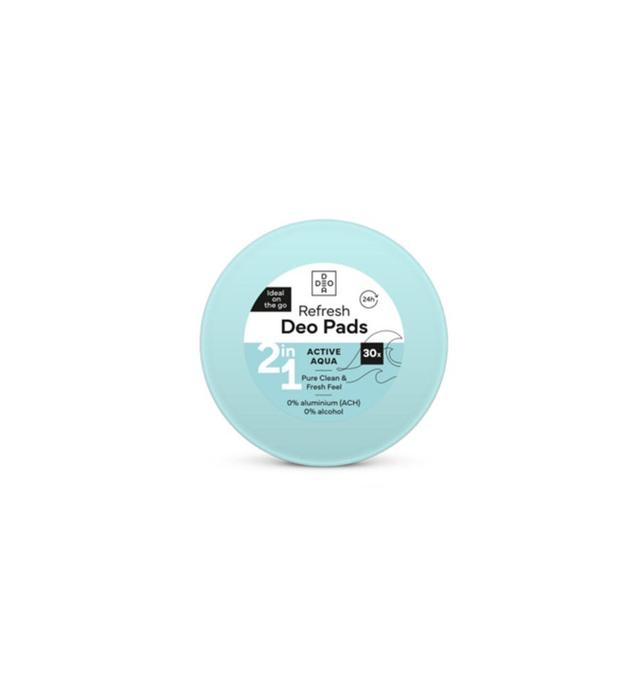 DEO PADS discos active aqua: 30 unidades para una higiene diaria suave y refrescante. Discos de absorción eficiente, aptos para piel sensible, sin irritación. Formato compacto ideal para bolso y viaje. Calidad DEODEA y tecnología active aqua para una piel limpia y cómoda sin residuos.