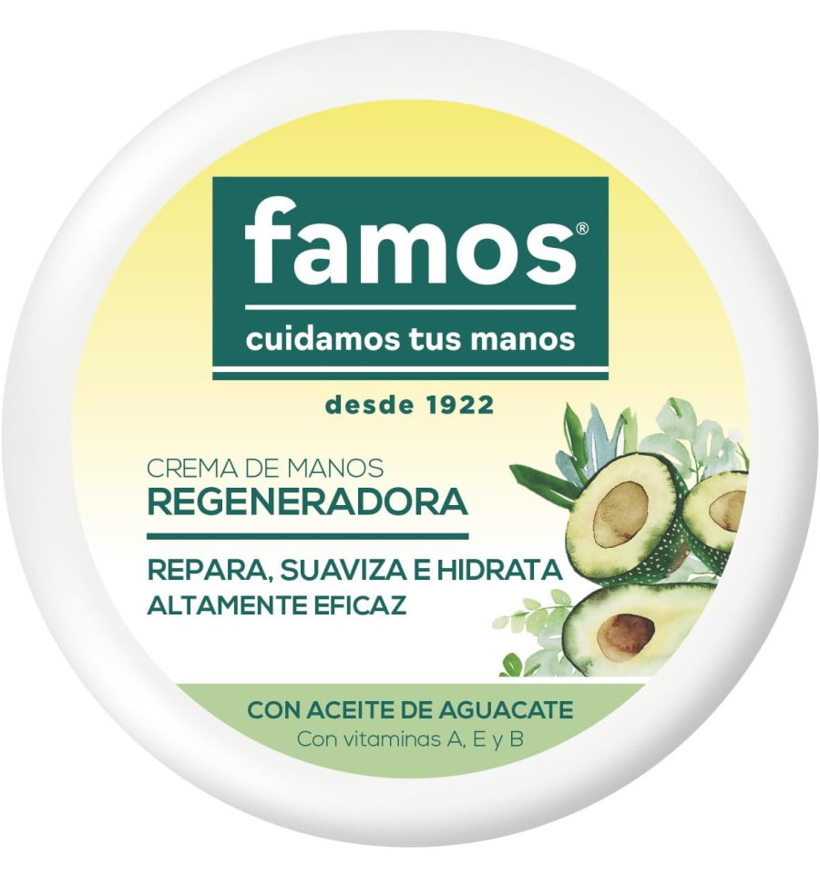 La Crema Regeneradora para manos de Famos repara, suaviza e hidrata la piel gracias a sus ingredientes de alta calidad y eficacia, proteínas, Retinol y antioxidantes. Formulado con aceite de aguacate. Resultados visibles. 100% eficaz. En formato tarro.