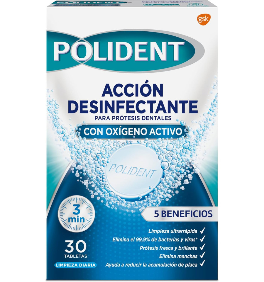 Tabletas limpiadoras para prótesis dentales de Polident Acción Desinfectante que elimina el 99,99% de las bacterias causantes del mal olor en tan sólo 3 minutos