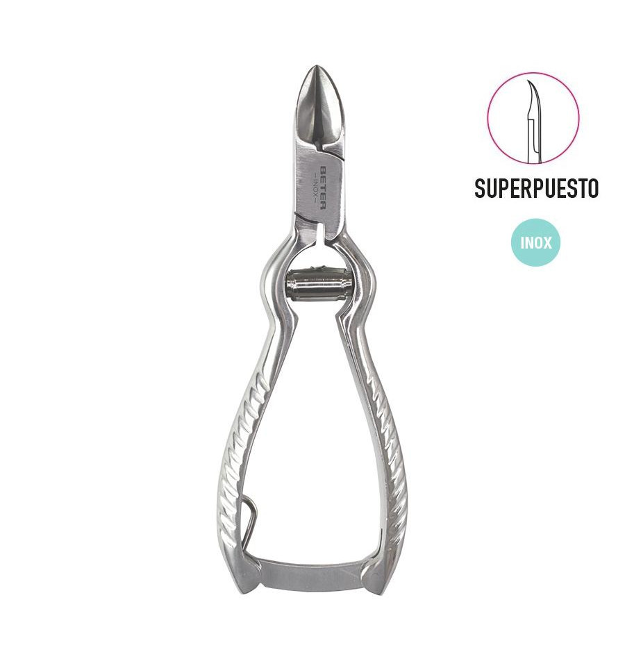 Modelo profesional con cierre ajustado de seguridad mediante muelle gusanillo. Garantiza un corte regular, preciso y seguro gracias a un riguroso proceso de fabricación con materiales de alta calidad y afilado individual. Indicado para el cuidado de las uñas de los pies. Cabezal superpuesto